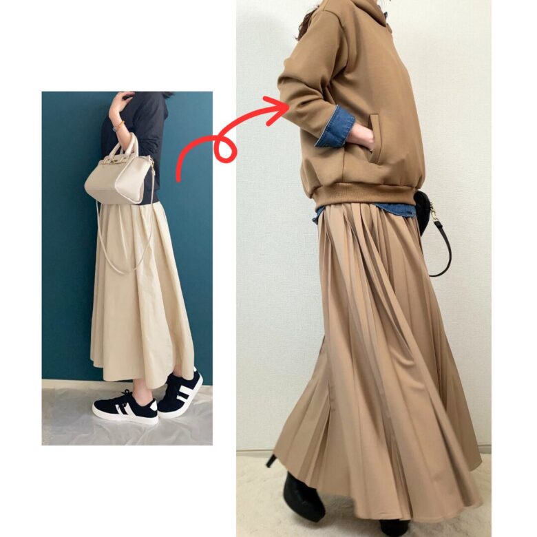 でもパーカーが長すぎるなど、視覚的に分断されると、せっかくのロングスカート効果が消えてしまうことも💦