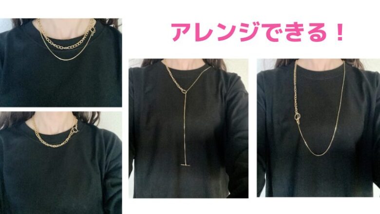 このネックレス、1本に違う種類のチェーンが付いているので、そのまま首に巻き付けて留めるだけ。