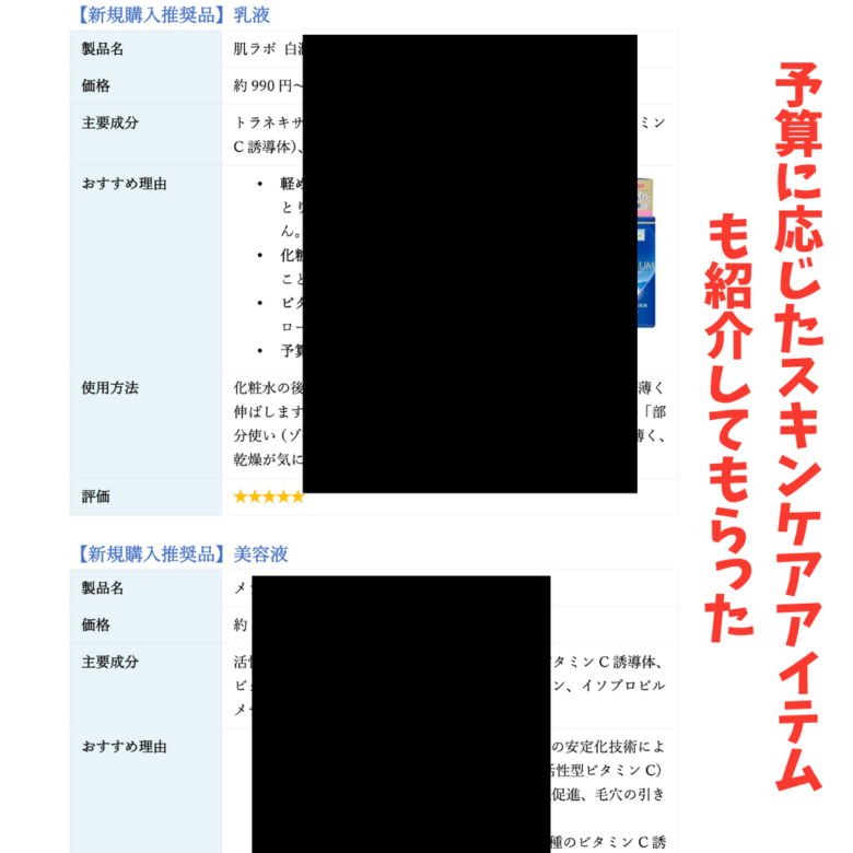 さらにわたしの1,000円台という予算内でおすすめの化粧品まで提案してくれて、