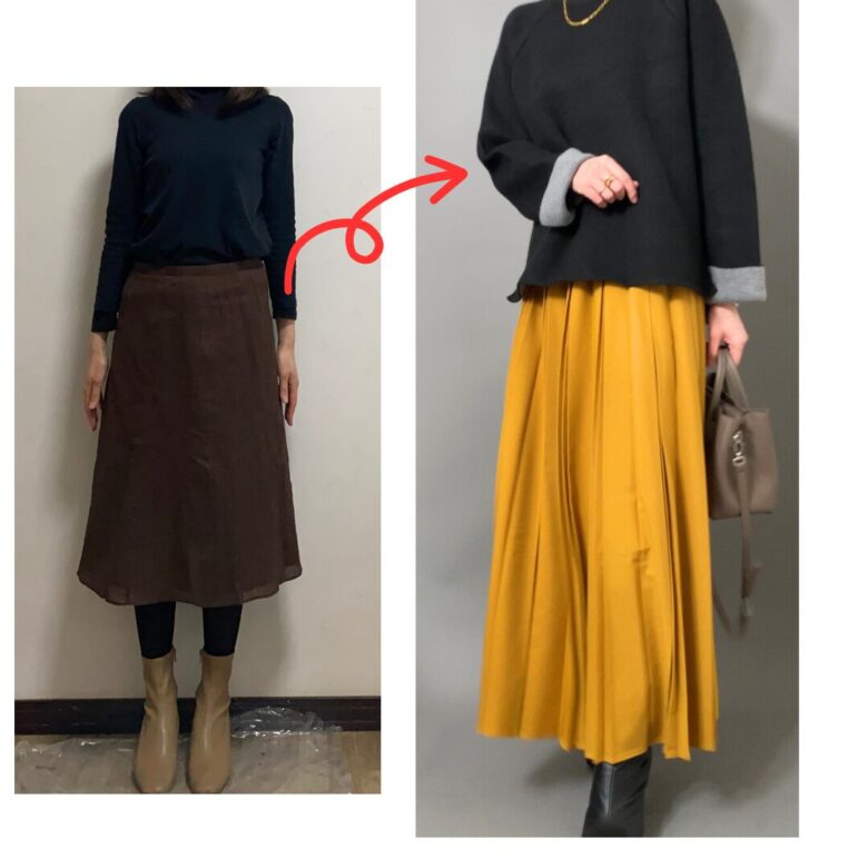 スカート×タイツがダサく見える原因って、色のバランスがチグハグになっているから💦